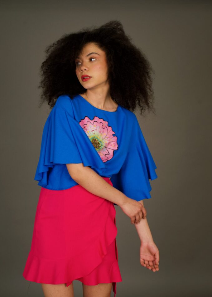 Bluza Betty Blue, perfectă pentru a adăuga un strop de culoare în garderoba ta. Această bluză este realizată din materiale naturale de înaltă calitate și este pictată manual, ceea ce îi conferă un aspect unic și deosebit.