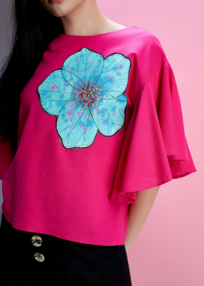 Bluza Rux cu floare, perfectă pentru a adăuga un strop de culoare în garderoba ta. Această bluză este realizată din materiale naturale de înaltă calitate și este pictată manual, ceea ce îi conferă un aspect unic și deosebit.