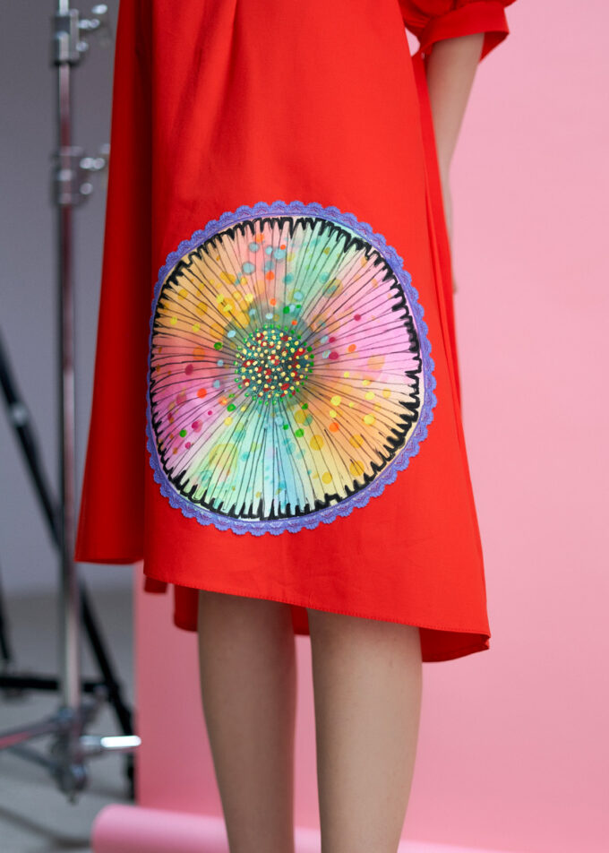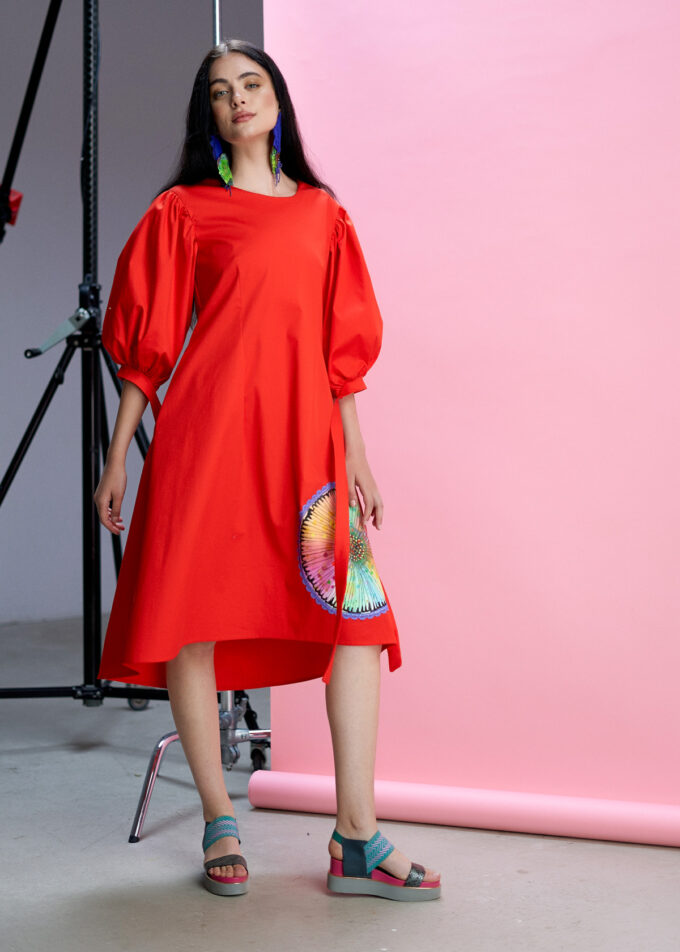 O caracteristică remarcabilă a acestei rochii este maneca bufantă, care adaugă un plus de eleganță și feminitate. În plus, cordoanele de la manecă oferă posibilitatea de ajustare a acesteia, pentru un confort sporit. Rochia este decorată cu un mac pictat, completând astfel aspectul său floral și fermecător.