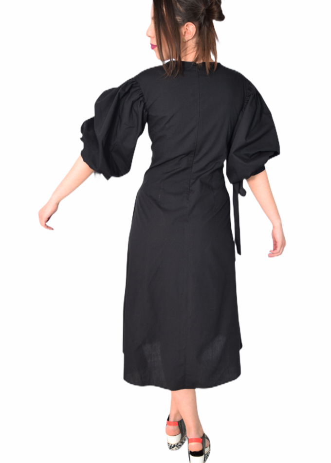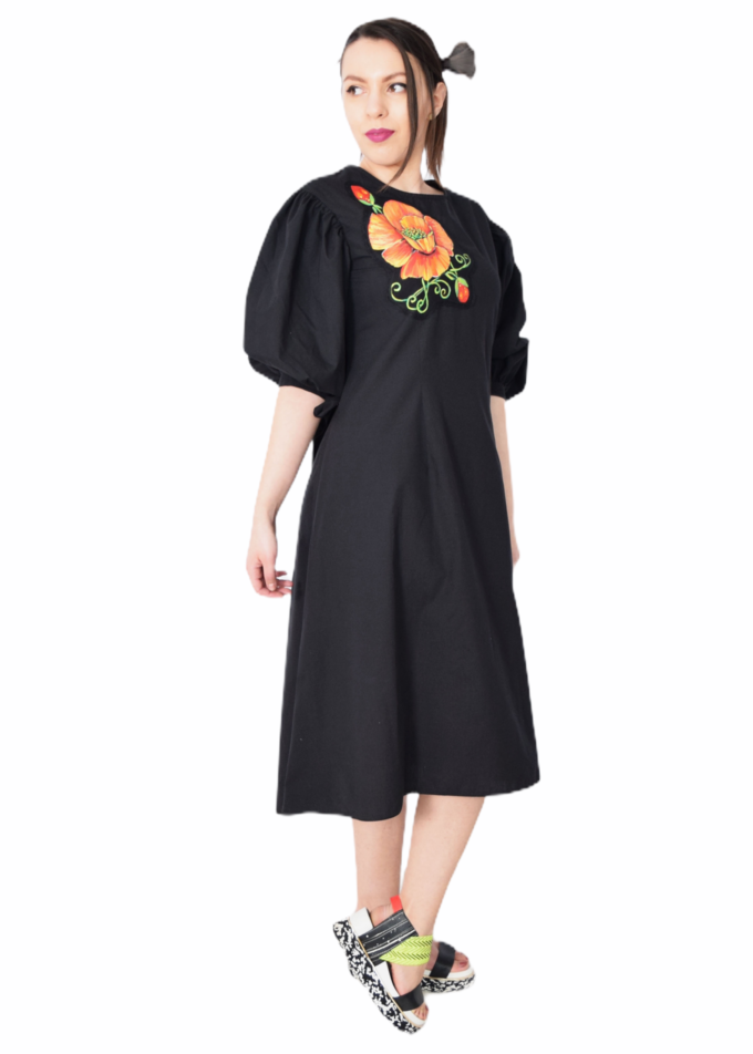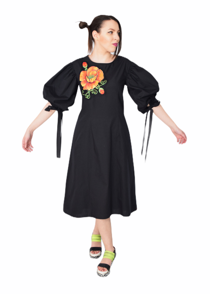 O caracteristică remarcabilă a acestei rochii este maneca bufantă, care adaugă un plus de eleganță și feminitate. În plus, cordoanele de la manecă oferă posibilitatea de ajustare a acesteia, pentru un confort sporit. Rochia este decorată cu un mac pictat, completând astfel aspectul său floral și fermecător.