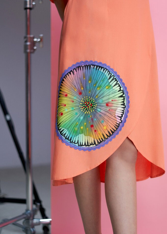 Rochia Porto perfectă pentru a adăuga un strop de culoare în garderoba ta. Această rochia este realizată din materiale naturale de înaltă calitate și este pictată manual, ceea ce îi conferă un aspect unic și deosebit .